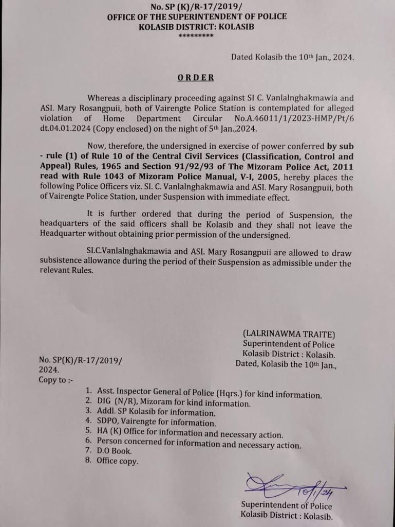 Vairengte police Checkgate-ah hian January ni 5, 2023-a duty-te’n hnam dang truck driver hnen atangin pawisa an la ni-a hriat a ni a, hemi nia duty Sub Inspector C Vanlalnghakmawia leh ASI Mary Zosangpuii te chu suspend an ni a, Constable paruk te District dangah sawn an ni bawk.